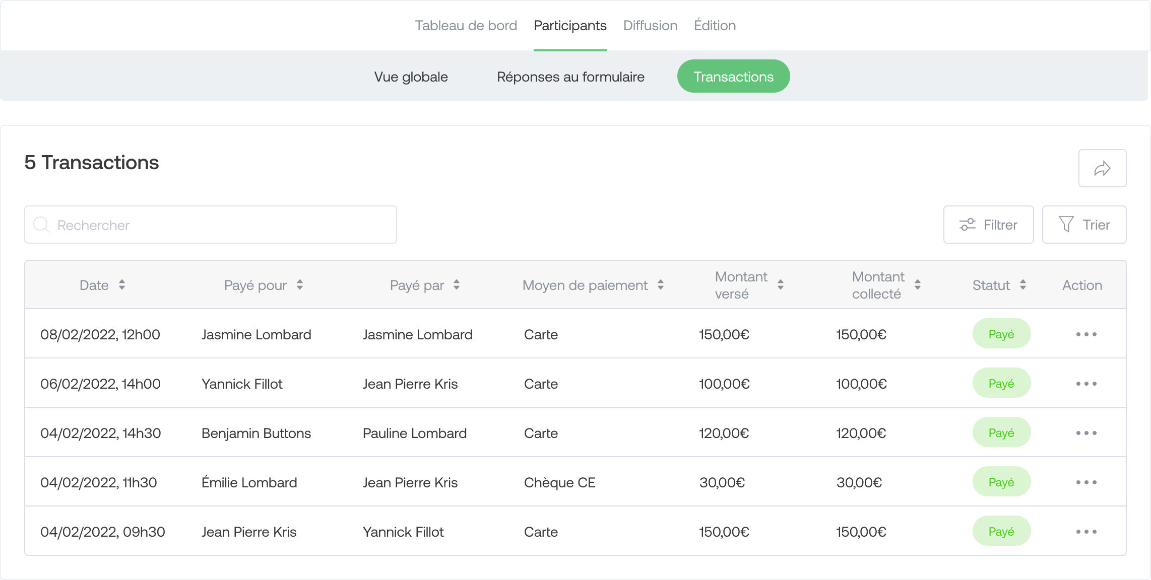 View here all transactions made on behalf of your participants. You can edit manually recorded transactions, but not card transactions.