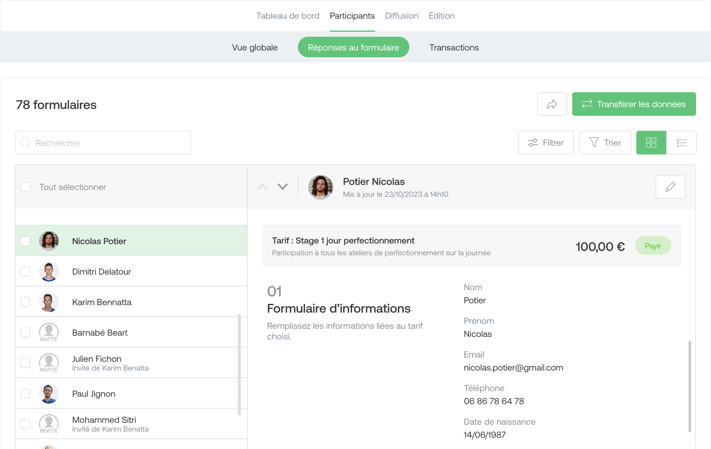 For each participant, you can view the details of their transactions as well as their form.