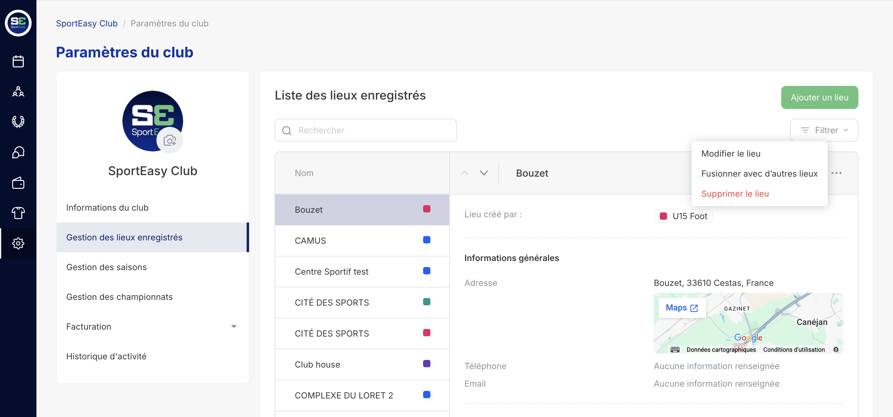 - Survoler la roue dentée "Paramètres" en bout de ligne du stade pour lequel vous souhaitez modifier et cliquer sur "Modifier le lieu"