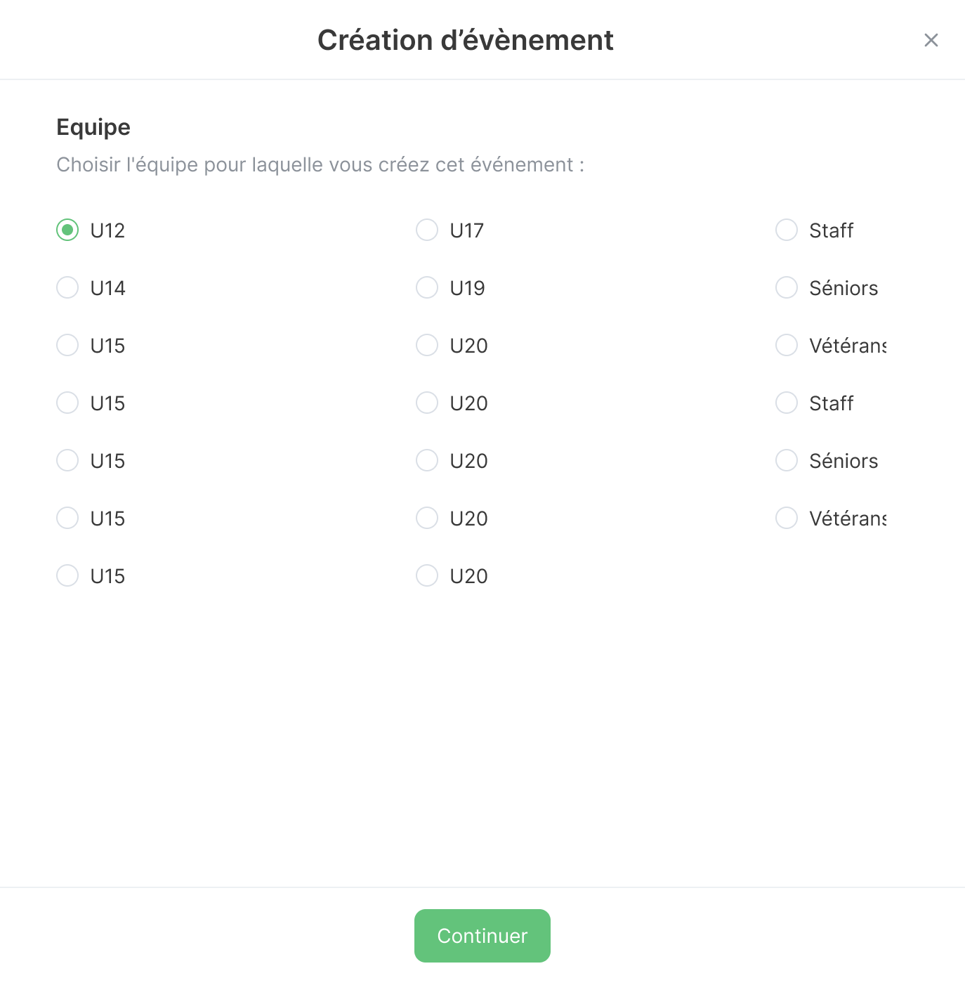 Il faut ensuite choisir l'équipe concernée par l'évènement.